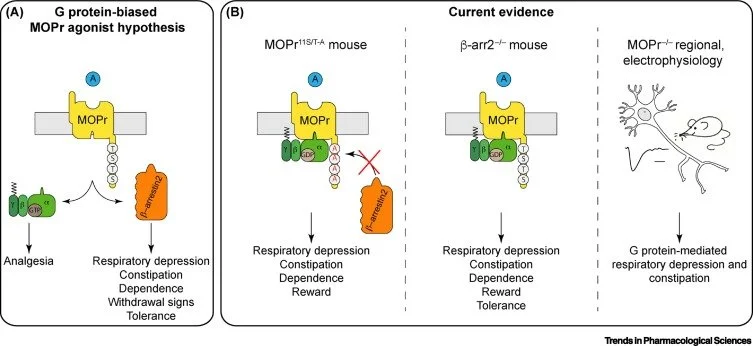 One hypothesis which has had particular interest is that opioid analgesia occurs through G protein-signalling, whereas side effects such as respiratory depression occurred through a proposed β-arrestin-dependent signal.