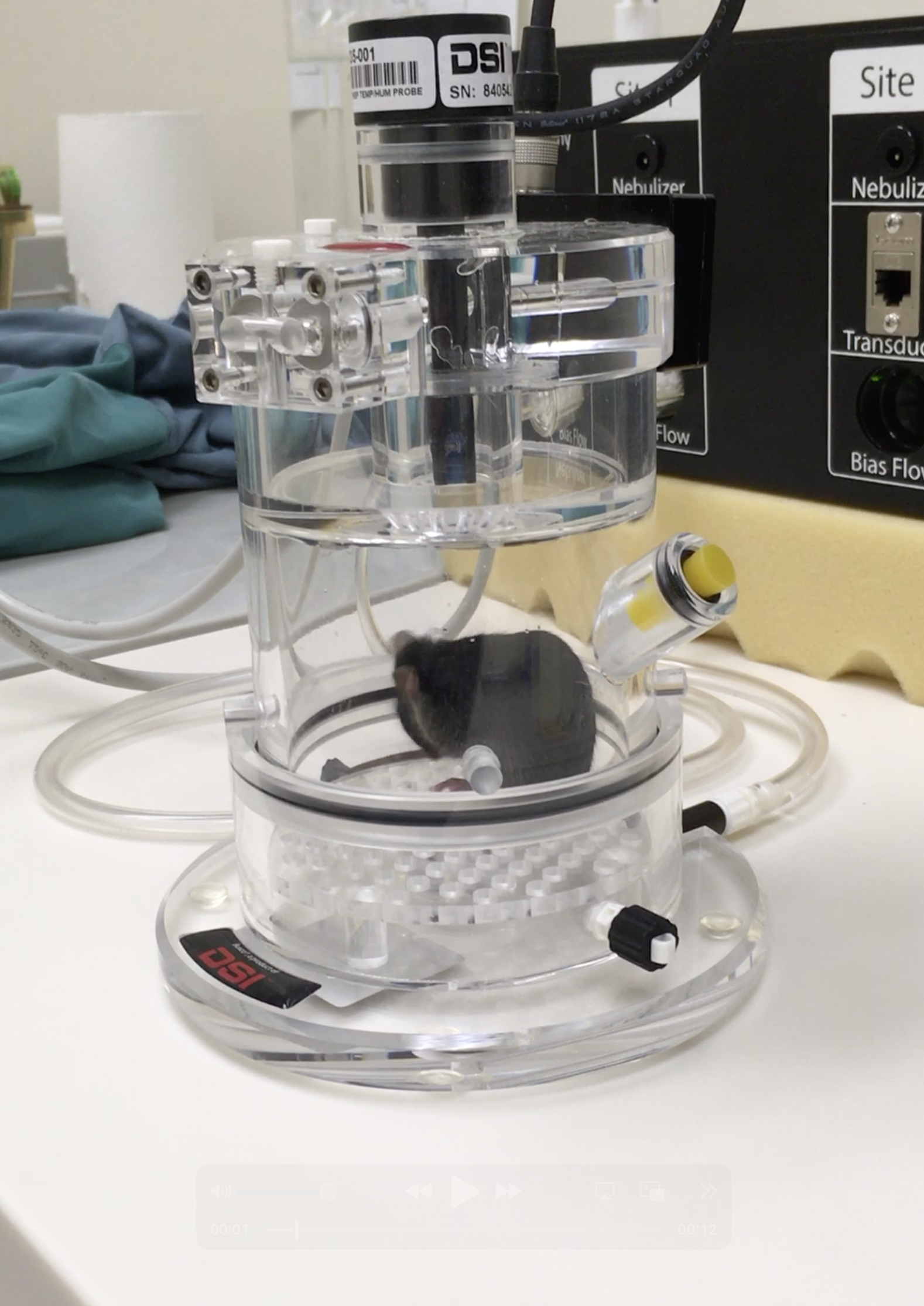 A technique which allows the assessment of respiratory parameters, such as breathing frequency and tidal volume, without necessitating restraint of an animal. Can be complemented by pulse oximetry.